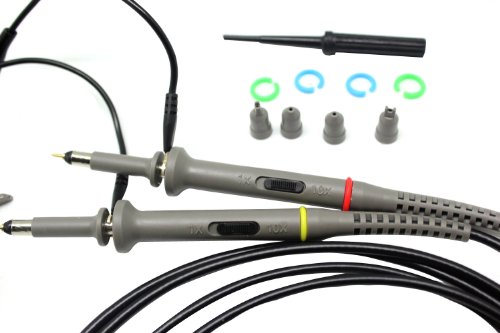 ◦Useable with scopes having Bandwidth up to 100 MHz ◦Interchangeable Probe Tip ◦Coaxial Reed Switch ◦Modular Construction ◦Compensation range: 15 to 35 pF ◦Input Capacitance: 1X: 85pF-115pF; 10X: 14.5pF-17.5pF ◦Input Resistance: 1X: 1Mohm; 10X: 10Mohm; ◦Bandwidth: 1X: DC-4MHZ, 10X: 100MHz ◦Attenuation Ration: 1:10 ◦Net Weight: 55g ◦Cable Length: 120cm ◦Operating Temp: -10C-50C ◦Operating Humidity: <=85-Percent ◦Maximum Input Voltage: 1X: 150 VDC, 2X: 300 VDC.